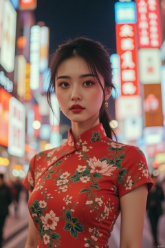 Full shot of a stylish Chinese woman posing against a vibrant city backdrop, head to toe. She wears a trendy, modern qipao and strikes a confident pose. The FG polaroid filter enhances the fresh, vibrant colors. The bustling city lights blur behind her, emphasizing the shallow depth of field and keeping her sharply in focus.