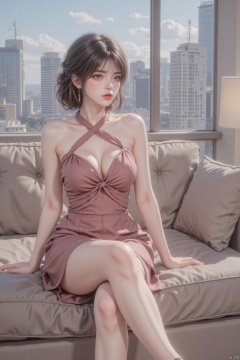 1girl, solo, breasts, looking at viewer, short hair, skirt, dress, bare shoulders, jewelry, medium breasts, sitting, closed mouth, full body, earrings, indoors, high heels, lips, legs, makeup, halterneck, couch, between legs, hand between legs, city, realistic, cityscape, skyscraper