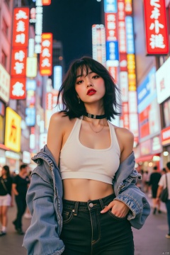 This is a high-resolution photograph of an Asian woman standing confidently in a bustling urban street scene, likely in a city with a vibrant Asian culture. The woman, with a slim, athletic build, has shoulder-length black hair that is slightly tousled, framing her face. She wears bold red lipstick, striking makeup, and a black choker necklace. Her outfit consisted of a white halter top that reveals her midriff, paired with a Loose fitting oversized blue denim jacket and high-waisted, loose-fitting black jeans with a slight taper. Her jeans have a subtle, textured pattern.The background features a dense array of colorful, vertical neon signs in various languages, creating a vibrant, energetic atmosphere. The signs are predominantly red, blue, and yellow, with some featuring Chinese characters. The street is lined with buildings of varying heights, with a mix of modern and traditional architecture. The scene is bustling with pedestrians, some of whom are blurred due to the shallow depth of field, which keeps the focus on the woman. The overall mood of the image is edgy and fashionable, capturing a modern, urban lifestyle.