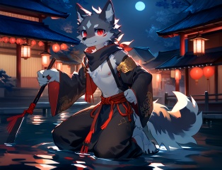 masterpiece,best quality,perfect anatomy,bright eyes,watery eyes,furry,wolf,(felis:0.25),male,solo,baggy clothing,detailed eyes,male focus,open clothes,(Water black Tang Costume:1.1),(night:1.1),(red eyes:1.1),angle:1.1),black scarf,a slim and well-proportioned figure,sketch,body fur,anthro,