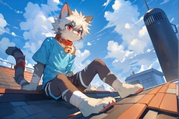 cat boy,1boy,solo,male_focus,(white_hair:0.8),red eyes,[bell on collar,Collar,Cortical collar,Large collar],(blue t-shirt,black_leggings under shorts,black bike_shorts),(barefoot) BREAK dutch angle,vanishing point,sitting on rooftop,(blue sky,cloud,wind),(masterpiece, best quality:1.1),foot focus,bandage on nose,bandage on leg,Tail decoration,cat tail,PVC Style,bare_shoulder,body fur,furry,Akira,anthro