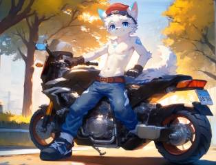 motor vehicle,ground vehicle,1boy,furry,male focus,solo,blue eyes,animal ears,outdoors,tail,motorcycle,hat,furry male,tree,gloves,pants,looking at viewer,smile,belt,white fur,navel,topless male,nipples,blue pants,white hair,red headwear,body fur,