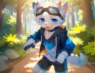 solo,looking at viewer,blush,short hair,blue eyes,gloves,1boy,white hair,male focus,sweat,outdoors,horns,shorts,choker,tongue,black gloves,hood,tongue out,tree,hoodie,goggles,nature,forest,goggles on head,male child,body fur,furry,