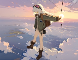 masterpiece,best quality,illustration,ultra detailed,hdr,Depth of field,(colorful),artist:tianliang duohe fangdongye,bright outline,1girl,solo,bomber jacket,pilot coat,goggles on the head,white long hair,Green eyes,four-leaf clover,wind-blown clothes,leather boots,leather material,bare legs,brown backpack,walkie-talkie,antenna,scout,exploration,signal transmitter,sunset,setting sun,Tyndall light,horizon,ultimate color,melancholy expression,the girl looks into the distance,parachute,cumulonimbus,clouds,aerial view,distant view,airship,hyperdetail,nature landscape,clouds,<lora:quality_modifiers_masterpieces_v1:0.35>,