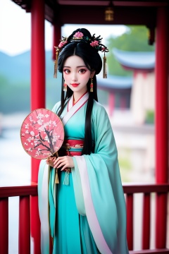 1girl, solo, hair ornament, hand fan, blurry background, chinese clothes, blurry, looking at viewer, realistic, hanfu, jewelry, holding, black hair, earrings, railing, outdoors