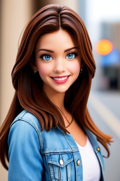 1girl, realistic, denim jacket, solo, photorealistic, brown hair, denim, looking at viewer, long hair, jewelry, blurry background, blurry, earrings, jacket, blue eyes, lips, smile