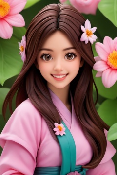 1girl, solo, flower, long hair, brown hair, smile, teeth, looking at viewer, hair ornament, upper body,