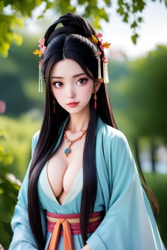 1girl, breasts, jewelry, hair ornament, upper body, long hair, looking at viewer, necklace, cleavage, hanfu, outdoors,
