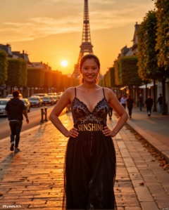 Here is a prompt for creating an exquisitely detailed image based on your description: A cinematic shot taken on the iconic Champs Elysées in Paris at dusk in autumn, as the sun dips below the horizon casting a warm glow (film grain: 1.2). A stunning Chinese woman, wearing a strapless low-cut long dress with intricate details and natural skin texture, stands out against the majestic Eiffel Tower's backdrop. Her radiant smile illuminates her deep cleavage, highlighting her plump breasts, as she proudly displays the bust of her dress featuring bold golden letters 'SUNSHINE'. The fallen leaves on the ground glisten with a warm golden light, reflecting the vibrant colors of the setting sun. Captured using Fujifilm XT3, in 4K resolution, this unity 8k wallpaper boasts ultra-detailed skin texture and finely detailed facial features, showcasing an exquisitely realistic masterpiece.