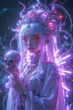A girl, like a fairy in the sky, a fairy and a demon, holds a skull in her hand, with white hair, long hair, elegant hair, red eyes, blood in her eyes, and glowing special effects behind her.The overall appearance is purple style.Realism
