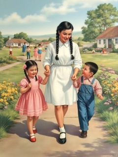 Era painting, a girl wearing a white dress, black hair, and two braids, holding a little girl in a pink dress with her left hand, and a boy in overalls with her right hand, walking on the path after school,