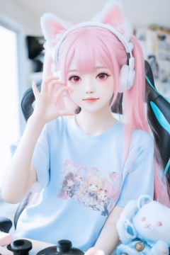 kawaii girl with soft aesthetic, ice blue long twin tails hair with straight bangs covering one eye, striking almond-shaped eyes with pink contacts and dramatic lashes, soft pale skin with rosy cheeks, wearing oversized light blue anime graphic t-shirt with manga character print in black and white, white and pink nekomimi headphones with fluffy cat ears, delicate heart-shaped face, soft ambient room lighting, pastel blue and pink color scheme, white gaming chair in background, cute plush toys on shelf, ethereal sparkle effects around face, professional beauty lighting setup, shot with Sony A7S III camera, 85mm portrait lens, shallow depth of field, high-key lighting style, ultra-detailed hair texture, glossy lips with subtle pink tint, cute kawaii hand gestures, highly detailed anime merchandise visible in shot, Japanese idol photo style, emphasis on large expressive eyes and innocent expression, 8k resolution, perfect cosplay makeup application, soft dreamy atmosphere,cute girl,photorealistic,