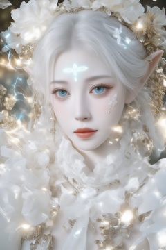 Create a highly detailed close-up image of a fantasy elf’s face, blending elements of cinematic art and modern digital design. Her pale skin glows with a soft, ethereal light, intricately adorned with golden, cracked patterns that evoke the delicate art of kintsugi, tracing along her features with a mystical glow. These patterns intertwine with neon tattoos, forming geometric shapes that pulse with a magical energy. Her large, mesmerizing eyes shift between shades of deep teal and oceanic blue, as if holding the mysteries of the sea within them, drawing the viewer into her intense, calm gaze. ..,(her hand crackling with huge electricity power as she gazes directly at the camera))