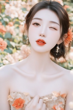 Woman's secrets whispered in twilight's hush: A Wong Kar Wai-esque close-up captures the mystery of a lone female, her raven tresses adorned with a vibrant red flower. Half-bodies entwined with pink and orange blooms, as if trying to conceal truths behind her striking red lips. One eye veiled, she gazes directly at us, collarbone and bare shoulders framing the beauty within. Shot on Fujifilm 100mm lens, filtered through film grain texture, color temperature set at 3200K, with a whisper of twilight's warmth.