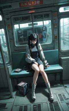 XUER guangying,<lora:绪儿光影滤镜XUER guangying:0.8>,score_9,score_8_up,score_7_up,score_6_up,score_5_up,score_4_up,XUER guangying,1girl,solo,long hair,black hair,long sleeves,dress,twintails,sitting,jacket,multicolored hair,boots,white footwear,ground vehicle,instrument,guitar,train interior,highly detailed,ultra-high resolution,32K UHD,sharp focus,best-quality,masterpiece,Emotionalization,golden hour,unconventional supreme masterpiece,masterful details,temperate atmosphere,with a high-end texture,in the style of fashion photography,magazine cover,Dynamic Angle,Dynamic posture,