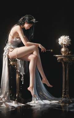 XUER guangying,<lora:绪儿光影滤镜XUER guangying:0.8>,score_9,score_8_up,score_7_up,score_6_up,score_5_up,score_4_up,XUER guangying,1girl,solo,long hair,breasts,dress,bare shoulders,jewelry,sitting,full body,closed eyes,barefoot,white dress,from side,profile,looking down,tiara,strap slip,plantar flexion,Black background,highly detailed,ultra-high resolution,32K UHD,sharp focus,best-quality,masterpiece,Emotionalization,golden hour,unconventional supreme masterpiece,masterful details,temperate atmosphere,with a high-end texture,in the style of fashion photography,black hair,