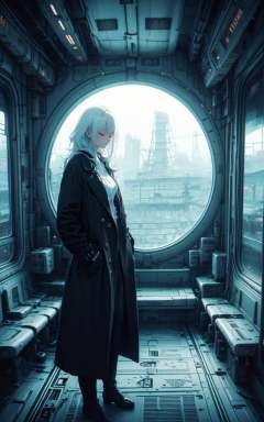 XUER guangying,<lora:绪儿光影滤镜XUER guangying:0.8>,score_9,score_8_up,score_7_up,score_6_up,score_5_up,score_4_up,black background,highly detailed,ultra-high resolution,32K UHD,sharp focus,best-quality,masterpiece,Emotionalization,golden hour,unconventional supreme masterpiece,masterful details,temperate atmosphere,with a high-end texture,in the style of fashion photography,magazine cover,XUER guangying,1girl,solo,long hair,bangs,closed mouth,standing,closed eyes,white hair,medium hair,coat,window,scenery,open coat,black coat,hands in pockets,train interior,