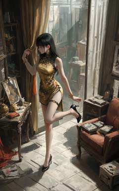 XUER guangying,<lora:绪儿光影滤镜XUER guangying:0.8>,score_9,score_8_up,score_7_up,score_6_up,score_5_up,score_4_up,1girl,solo,long hair,breasts,bangs,black hair,closed mouth,standing,full body,sleeveless,high heels,bare legs,thigh strap,sleeveless dress,chinese clothes,leg up,standing on one leg,china dress,side slit,golden dress,indoors,book,bottle,box,mirror,tiles,tile floor,(from above:1.3),(from side,profile:1.1),highly detailed,ultra-high resolution,32K UHD,sharp focus,best-quality,masterpiece,golden  hour,unconventional    supreme  masterpiece,masterful details,temperate atmosphere,with a high-end texture,curtains,table,couch,bead_bracelet,black_pantyhose,tassel,earrings,