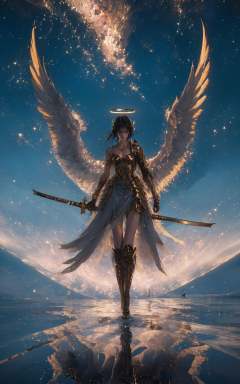 XUER guangying,<lora:绪儿光影滤镜XUER guangying:0.8>,score_9,score_8_up,score_7_up,score_6_up,score_5_up,score_4_up,XUER guangying,1girl,black hair,bare shoulders,jewelry,solo focus,angel wings,cleavage,medium breasts,wings,necklace,armor,blood,chain,halo,holding sword,shoulder armor,fighting_stance,black hair,shadow,sky,ground vehicle,star (sky),scenery,starry sky,reflection,riding,space,planet,highly detailed,ultra-high resolution,32K UHD,sharp focus,best-quality,masterpiece,Emotionalization,golden hour,unconventional supreme masterpiece,masterful details,temperate atmosphere,with a high-end texture,in the style of fashion photography,