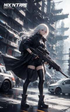 XUER guangying,<lora:绪儿光影滤镜XUER guangying:0.8>,score_9,score_8_up,score_7_up,score_6_up,score_5_up,score_4_up,XUER guangying,1girl,long hair,looking at viewer,bangs,blue eyes,thighhighs,gloves,holding,hair between eyes,jewelry,closed mouth,standing,jacket,weapon,white hair,boots,outdoors,shorts,solo focus,black gloves,fingerless gloves,necklace,holding weapon,gun,robot,ground vehicle,building,holding gun,motor vehicle,rifle,science fiction,city,car,assault rifle,scope,helicopter,highly detailed,ultra-high resolution,32K UHD,sharp focus,best-quality,masterpiece,Emotionalization,golden hour,unconventional supreme masterpiece,masterful details,temperate atmosphere,with a high-end texture,in the style of fashion photography,magazine cover,Dynamic Angle,Dynamic posture,