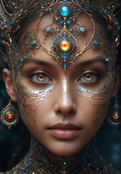 (8k, RAW photo, highest quality),hyperrealistic abstract style portrait of an otherworldly being with metallic skin,glowing orbs for eyes,and intricate fractal patterns emanating from their face,non-representational,colors and shapes,expression of feelings,imaginative,highly detailed,<lora:XL绪儿-引魂灯:0.6>,