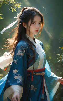 Textured skin,skin particles,1girl,hanfu,blue print,looking at view,outdoors,forest,sunlight passing through leaves,shrubs,flowers,wind blowing hair,light ray,(rimming light:1.3),<lora:XL绪儿-引魂灯:0.6>,
