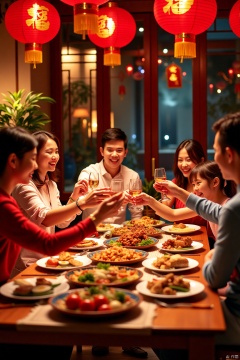 A festive Chinese New Year family banquet scene, set in a warmly lit traditional dining room with red lanterns and gold decorations adorning the walls. The table is laden with an array of traditional dishes, steaming hot and richly colored, surrounded by a family dressed in their holiday best, smiling and clinking glasses in celebration. The composition captures the intimate moment of joy, with the family seated around the table, framed by the vibrant decor and warm lighting, creating a sense of warmth and togetherness.