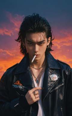 (8k, RAW photo, highly detailed,masterpiece, highest quality),rich colors,high contrast,full shot body photo of the most beautiful artwork in the world,cinematic light,fantasy,highres,xuer film still,solo,looking at viewer,black hair,1boy,jewelry,jacket,male focus,earrings,necklace,bracelet,black jacket,mouth hold,ring,watch,cigarette,realistic,smoking,wristwatch,leather,undercut,leather jacket,multiple rings,<lora:绪儿电影剧照:0.8>,unconventional supreme masterpiece,masterful details,temperate atmosphere. (balanced center composition:0.5),clouds on the ground,dark grey sky with neon orange clouds,glowing neon light orange and pink color tone,low saturations,dim lighting,highly detailed,ultra-high resolutions,32K UHD,best quality,masterpiece,
