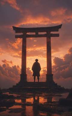 (RAW photo, highly detailed,masterpiece, highest quality),rich colors,high contrast,full shot body photo of the most beautiful artwork in the world,cinematic light,fantasy,highres,xuer film still,solo,black hair,1boy,standing,male focus,outdoors,sky,cloud,from behind,bird,cloudy sky,scenery,sunset,facing away,torii,ruins,wide shot,pillar,<lora:绪儿电影剧照:0.6>,unconventional supreme masterpiece,masterful details,temperate atmosphere. (balanced center composition:0.5),clouds on the ground,dark grey sky with neon orange clouds,glowing neon light orange and pink color tone,low saturations,dim lighting,highly detailed,ultra-high resolutions,32K UHD,best quality,masterpiece,