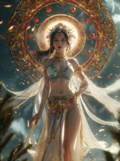 xuer Chinese goddess,1girl,jewelry,solo,navel,breasts,earrings,long hair,black hair,armlet,looking at viewer,parted lips,necklace,standing,ponytail,pelvic curtain,hand on hip,realistic,forehead mark,petals,backlighting,from below,circlet,bra,midriff,hair ornament,bikini,bare shoulders,swimsuit,forehead jewel,lips,(from below:1.1),(full body:1.1),(wide shot, wide-angle lens,Panoramic:1.2),<lora:绪儿-中国女神xuer Chinese goddess:0.75>,<lora:xuer a sense of story girl_20240320200924:0.5>,