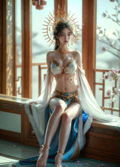 xuer Chinese goddess,1girl,jewelry,barefoot,solo,sitting,anklet,earrings,navel,black hair,hair ornament,necklace,indoors,full body,breasts,petals,window,bra,bare legs,realistic,feet,<lora:绪儿-中国女神xuer Chinese goddess:0.75>,