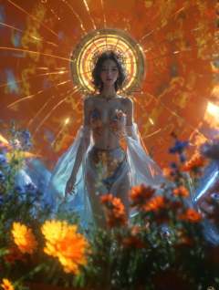 xuer Chinese goddess,1girl,flower,jewelry,black hair,navel,solo,earrings,breasts,necklace,bare shoulders,(from below:1.4),(full body:1.5),(wide shot, wide-angle lens,Panoramic:1.2),<lora:绪儿-中国女神xuer Chinese goddess:0.75>,<lora:xuer a sense of story girl_20240320200924:0.5>,