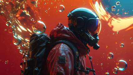 (8k, RAW photo, highly detailed,masterpiece, highest quality),rich colors,high contrast,full shot body photo of the most beautiful artwork in the world,cinematic light,fantasy,highres,xuer film still,solo,1boy,upper body,male focus,hood,from side,backpack,helmet,red background,1other,bubble,underwater,orange background,air bubble,red theme,ambiguous gender,orange theme,<lora:绪儿电影剧照-xuer film still:0.8>,