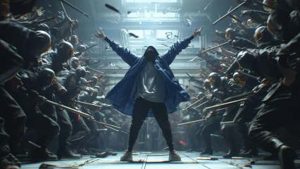 (8k, RAW photo, highly detailed,masterpiece, highest quality),rich colors,high contrast,full shot body photo of the most beautiful artwork in the world,cinematic light,fantasy,highres,Look up to the sky,xuer film still,shirt,black hair,long sleeves,holding,standing,jacket,white shirt,weapon,multiple boys,open clothes,shoes,pants,indoors,hood,holding weapon,open jacket,gun,black pants,outstretched arms,blue jacket,holding gun,hooded jacket,rifle,hood up,6+boys,battle,shell casing,6+others,<lora:绪儿电影剧照-xuer film still:0.8>,