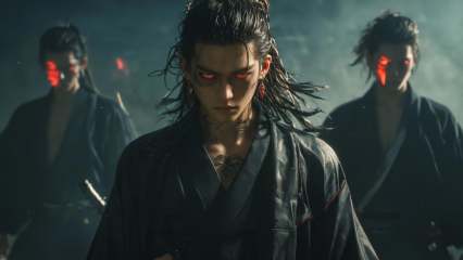 (8k, RAW photo, highly detailed,masterpiece, highest quality),rich colors,high contrast,full shot body photo of the most beautiful artwork in the world,cinematic light,fantasy,highres,xuer film still,long hair,looking at viewer,black hair,red eyes,jewelry,closed mouth,upper body,weapon,male focus,earrings,japanese clothes,multiple boys,solo focus,sword,kimono,tattoo,glowing,scar,glowing eyes,scar on face,backlighting,6+boys,robe,silhouette,<lora:绪儿电影剧照-xuer film still:0.8>,