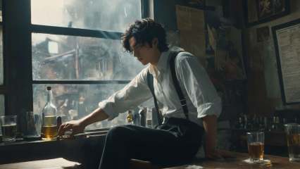 (8k, RAW photo, highly detailed,masterpiece, highest quality),rich colors,high contrast,full shot body photo of the most beautiful artwork in the world,cinematic light,fantasy,highres,xuer film still,solo,short hair,shirt,black hair,long sleeves,1boy,sitting,white shirt,male focus,collared shirt,pants,indoors,cup,window,profile,black pants,table,suspenders,bottle,scenery,alcohol,drinking glass,wine bottle,<lora:绪儿电影剧照-xuer film still:0.8>,