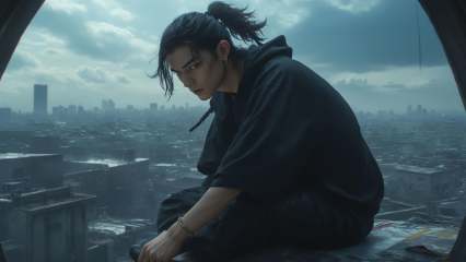 (8k, RAW photo, highly detailed,masterpiece, highest quality),rich colors,high contrast,full shot body photo of the most beautiful artwork in the world,cinematic light,fantasy,highres,(full body:1.7),xuer film still,solo,looking at viewer,black hair,1boy,jewelry,sitting,closed mouth,ponytail,male focus,earrings,sky,pants,cloud,hood,window,blood,hoodie,hood down,scenery,city,cityscape,<lora:绪儿电影剧照-xuer film still:0.8>,
