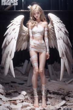 offcial art, colorful, Colorful background, splash of color,movie perspective, (advertising style, magazine cover:1.4),A beautiful woman with delicate facial features,(meca style), full body portrait,Best quality,masterpiece,ultra high res,Modern, Chinese, Song rhyme, Oriental,pretty,Blue eyes,(wide shot, wide-angle lens,Panoramic:1.2),super vista, super wide Angle,Low Angle shooting, super wide lens, (ring:1.3),looking down,hair flower,angel,(Milky skin, shiny skin:1.5),(bandages:1.4),feathered wings,angel wings,barefoot,blush,blood on clothes, (skinny legs:1.5), platinum blonde hair, own hands together,medium breasts,<lora:天使堕入人间V2 angel:0.8> <lora:绪儿-混血脸pretty:0.7>