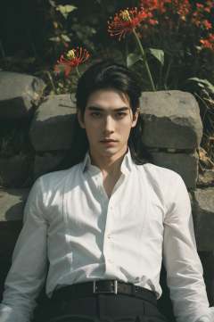 1male,handsome male,spider lily,sky,mountain,morrisstyle,Pinup,lying,