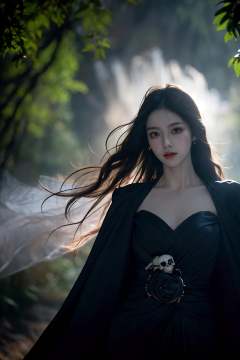 The Skeleton young Witch, flying, epoxy_skull, amidst a black swirling vortex in a dark, mystical forest. A beautiful woman with long hair stands, her figure draped in skeletal armor and an ethereal dress, engulfed by the swirling darkness. The scene is intensely cinematic, dominated by deep shadows pierced by subtle hints of light, crafting a dramatic interplay of darkness and luminescence. Wind, intensified to 1.2, weaves through the trees, enhancing her enigmatic silhouette, now surrounded by black smoke and the eye of a storm. Close-up on her sad expression, amidst sparkling embers and a billowing long piece of cloth,