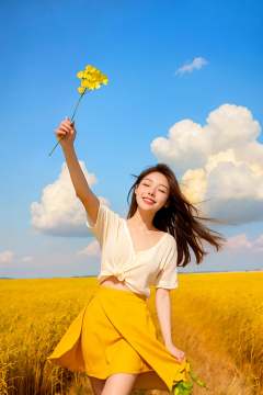 1 girl, brown hair, wearing an orange skirt, face to the blue sky, eyes closed, smiling, surrounded by yellow wheat fields, yellow ginkgo floating in the sky, white clouds floating in the blue sky, cartoon style, high quality, high resolution, look up, three-ee point oint perspective, the deep knee