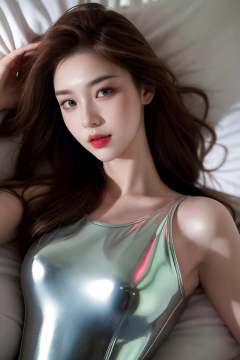 high quality fingers, normal hands, detailed fingers,masterpiece, (realistic, photo-realistic:1.37), 22 years old woman lying on her bed , medium breast, ginger hair, glamour, blue eyes, beautiful face, perfect illumination, beautiful detailed eyes,looking at viewer, stunningly beautiful woman, detailed hairstyle, detailed background, latex full body suit, (latex), lying on back, top down view,