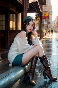 ((masterpiece)),((best quality)),((high detial)),((realistic,)),1girl,Industrial age city, deep canyons in the middle, architectural streets, bazaars, Bridges, rainy days, steampunk, European architecture,A mature face,sideways glance, (cold attitude,eyeshadow,eyeliner:0.9),watery eyes, colored stockings,ankle boots,pleated_skirt,beret,