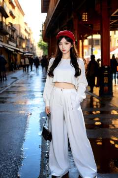 ((masterpiece)),((best quality)),((high detial)),((realistic,)),1girl,Industrial age city, deep canyons in the middle, architectural streets, bazaars, Bridges, rainy days, steampunk, European architecture,A mature face,sideways glance, (cold attitude,eyeshadow,eyeliner:0.9),watery eyes, beret, white wide-leg pants,
