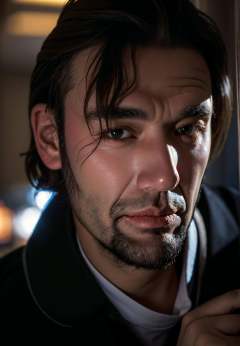 An President Lincoln,Gritty Portrait Photo of a weary,rugged individual sitting in a sparse,nondescript diner,his eyes betraying a sense of resigned acceptance,illuminated by the stark,fluorescent light overhead,from a close-up perspective,showcasing the film's exploration of fate,inevitability,and the changing nature of the world,