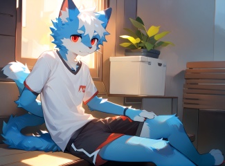 solo,male_focus,furry, (white_hair,red_eyes),(blue fur,cat_ears), body_fur,white_fur,t-shirt,shorts, BREAK, portrait,sitting,on_side, (masterpiece, best quality:1.1),body fur,<lora:indigoVoidFurryFused_v29:0.1>,