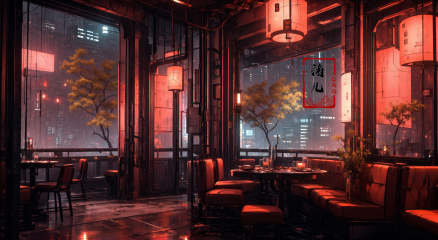 masterpiece, best quality, 8k,lindoor,1girl, solo,sitting,restaurant,science fiction,glowing,weapon,window,no humans,architecture,night,lantern,plant,tree,indoors,<lora:indoor_20230827164629:0.8>