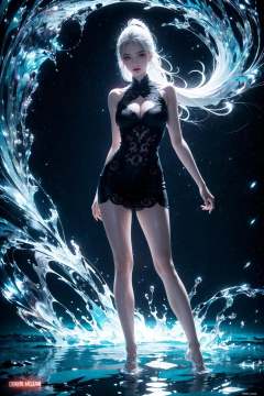 masterpiece, best quality, 8k, insane details, intricate details, hyperdetailed, hyper quality, high detail, ultra detailed, detailed background,(black background:1.2),[(black background:1.5)::5],yushuishu,(1girl,solo:1.5),(solo focus:1.7),black hair,water,waves,lips,High ponytail,(absurd long ponytail:1.3),(Real water,Realistic water,flowing water:1.5),picture-perfect face, flawless, clean, masterpiece, professional artwork, famous artwork, cinematic lighting, cinematic bloom, (full body:1.5),Beautiful girl, Exquisite and beautiful features, An amazing fantasy background,Chinese mythology, in the style of realistic and hyper-detailed renderings,mature female, tall body, sideways glance,cold attitude,eyeshadow,eyeliner,(long legs:1.3), (random hair style:1.2),(white hair:1.3),A shot with tension,(sky glows red,Visual impact,giving the poster a dynamic and visually striking appearance:1.2),<lora:绪儿-剪影curvy:0.8>