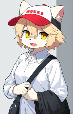 1girl, solo, looking at viewer, short hair, open mouth, blonde hair, shirt, long sleeves, hat, hair between eyes, yellow eyes, upper body, collared shirt, bag, bandaid, baseball cap,body fur,furry
