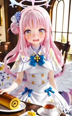 masterpiece,best quality,high quality,loli,PVC Style,1girl,mika \(blue archive\),halo,pink hair,solo,swiss roll,wings,hair bun,teacup,cup,food,yellow eyes,long hair,single side bun,white capelet,white wings,white dress,table,looking at viewer,capelet,dress,hair ornament,angel wings,flower,indoors,open mouth,hair flower,cake,feathered wings,chair,blurry,tea,bow,blue bow,blush,pink halo,scrunchie,wavy mouth,sidelocks,sitting,saucer,sweatdrop,plate